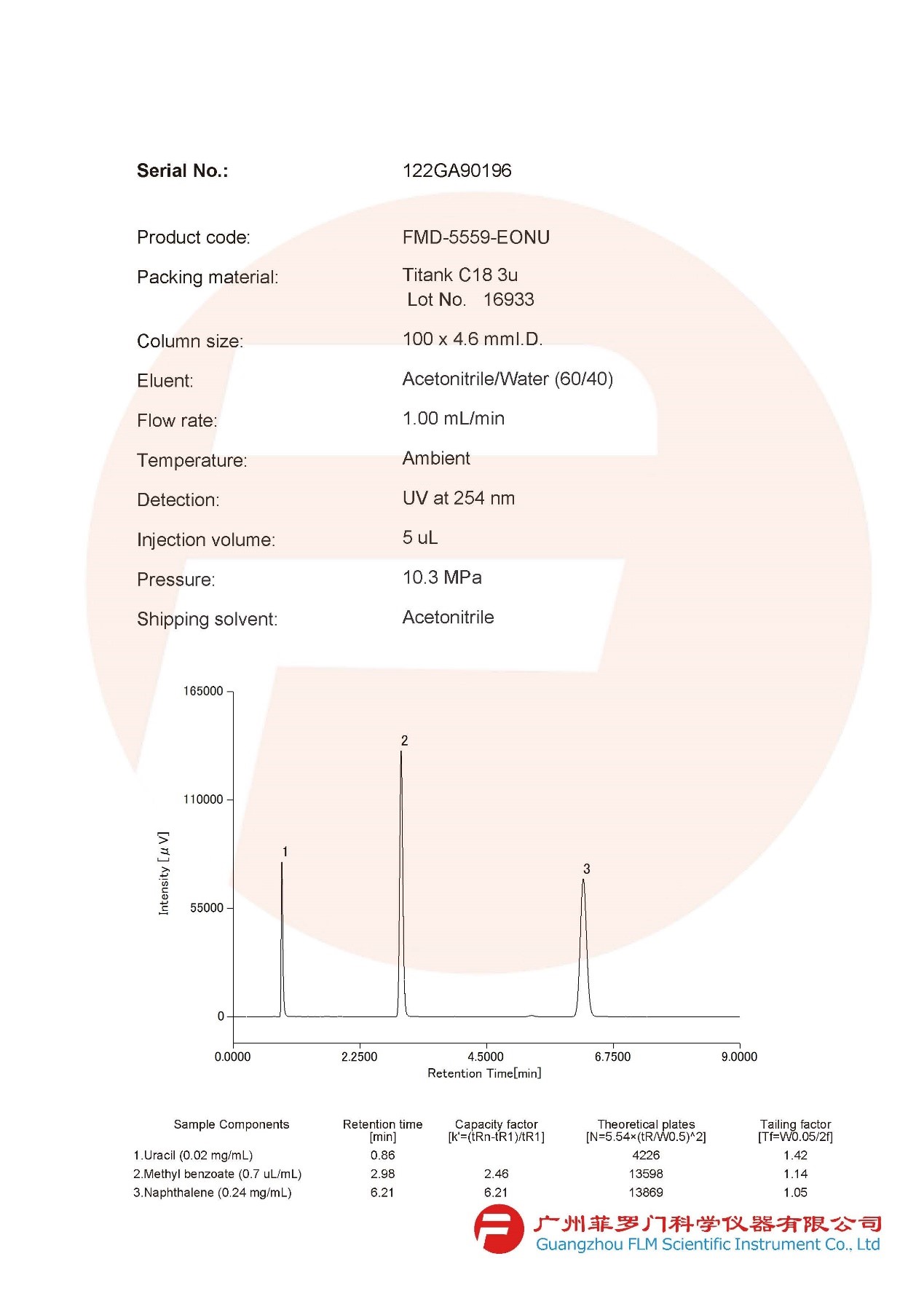 色譜柱測試時,可以根據廠家隨柱附帶的測試報告來測試。當然,各實驗室可根據自己的要求配制自己的標準溶質。