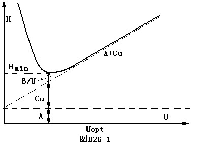 圖B26-1 為H-u曲線,曲線上Hmin對應最佳線速度Uopt,根據柱長L與塔板高度H的關系,理論塔板數n=L/H,在給定條件下,若在最佳流速下進行操作,可獲得最高柱效。在曲線的最低點,塔板高度H最小(H最小)。