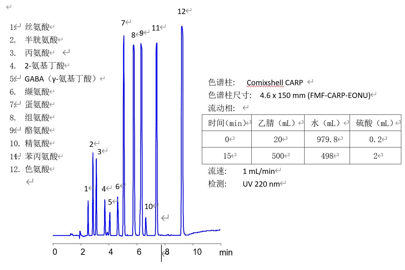 Comixshell CARP 色譜柱對(duì)12種非衍生氨基酸的HPLC分離(沒有離子對(duì)試劑)