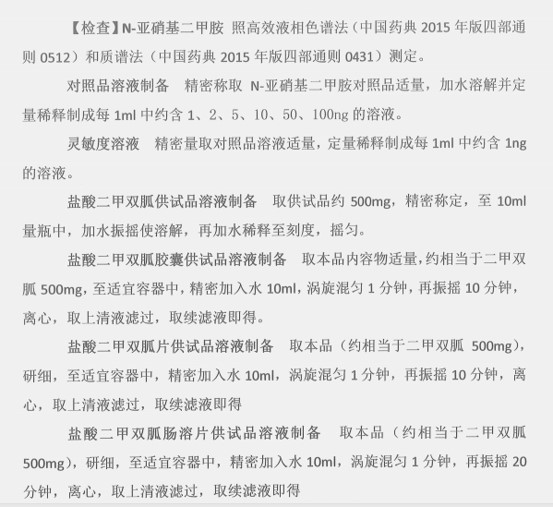【檢查】N-亞硝基二甲胺 照高效液相色譜法(中國藥典2015年版四部通則0512)和質譜法(中國藥典2015年版四部通則0431)測定。