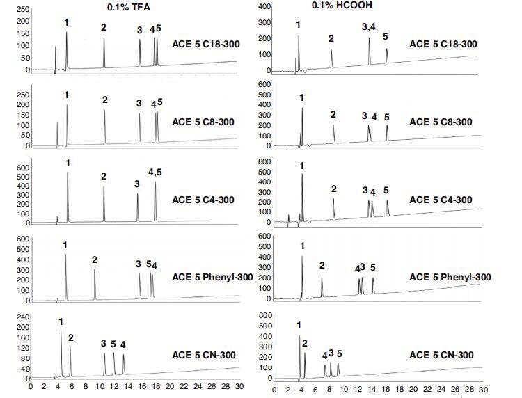 溫度升高會對多肽分離的選擇性有一定程度的影響,因此選擇適當的溫度,對多肽分離,尤其是肽圖分析顯得尤為重要。