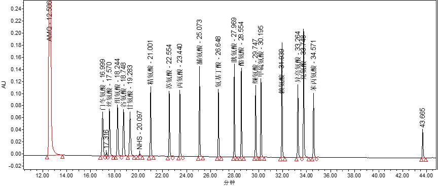 通過衍生反應在氨基酸上接上疏水且有紫外吸收的基團,可以實現在C18柱+反相流動相的體系下進行HPLC分析。