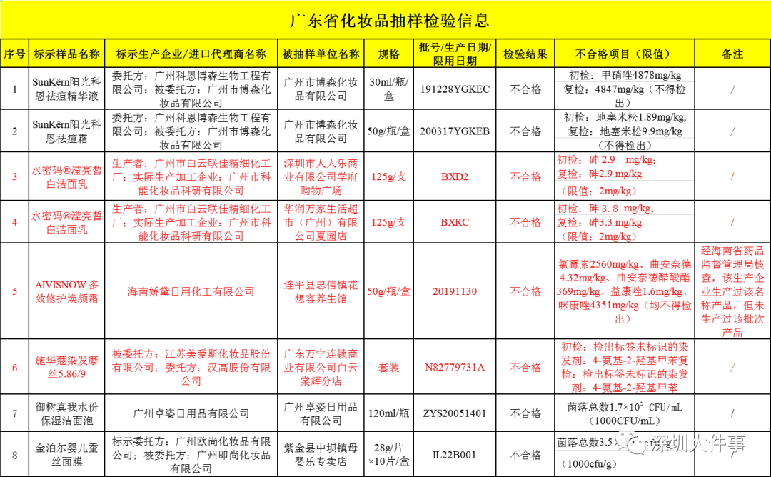 深圳市人人樂商業(yè)有限公司學(xué)府購(gòu)物廣場(chǎng)銷售的、廣州市科能化妝品科研有限公司生產(chǎn)的水密碼瀅亮皙白潔面乳,初檢、復(fù)檢的砷含量檢出值均為2.9 mg/kg;