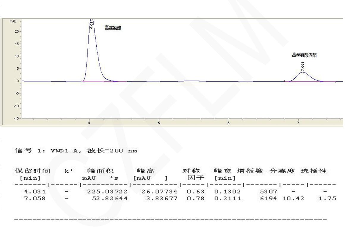 方法說明:通過 Comixsil RP-100 陽離子交換(陰離子排阻)+疏水+HILIC 的混合模式作用, 可以將這兩個化合物分離。