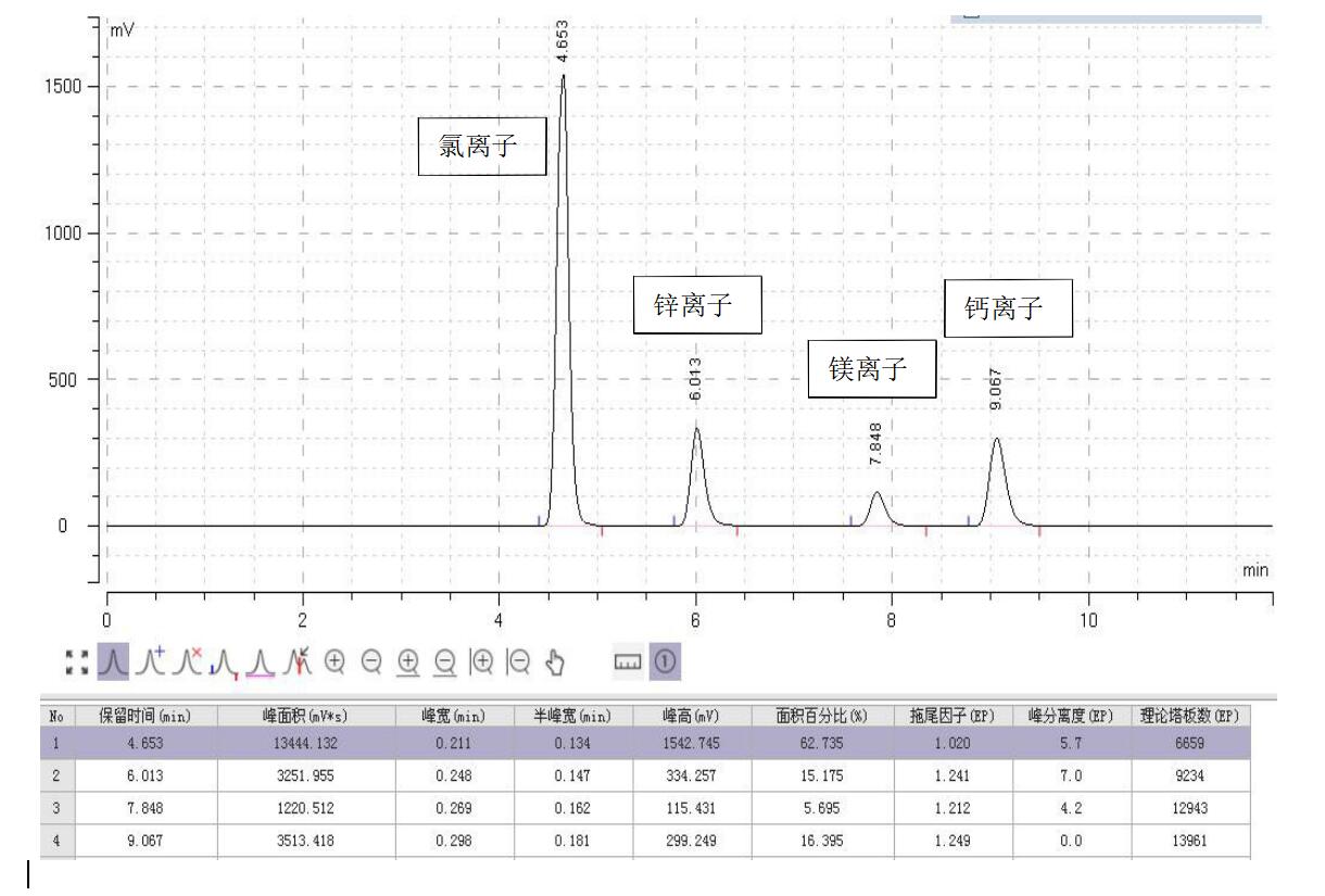 方法說明:上述圖譜采用氯化鋅、氯化鎂、氯化鈣做標品,溶劑為 0.1%鹽酸溶液(若采用其它溶劑,鋅離子無法正常出峰),峰型受鹽濃度影響,鹽濃度高峰型好,保留時間受緩沖鹽 pH 及有機相比例影響。