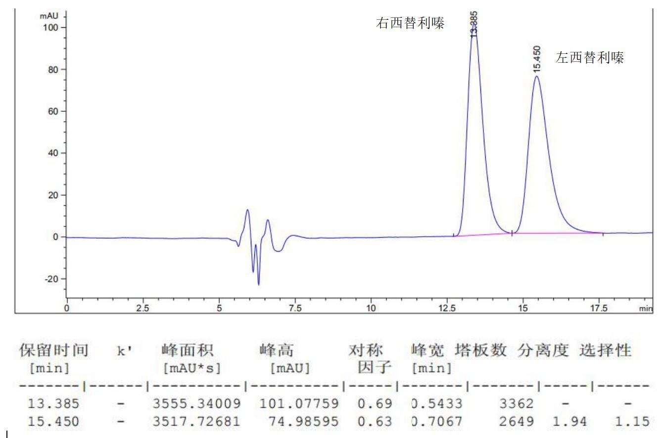 方法說明:根據(jù)標(biāo)準(zhǔn)要求,出峰順序依次為右西替利嗪與左西替利嗪,左西替利嗪拖尾因子不大于 2.0,右西替利嗪與左西替利嗪分離度應(yīng)大于 1.4,使用 Chiral NS(2)-RH 進行分析可滿足標(biāo)準(zhǔn)要求。