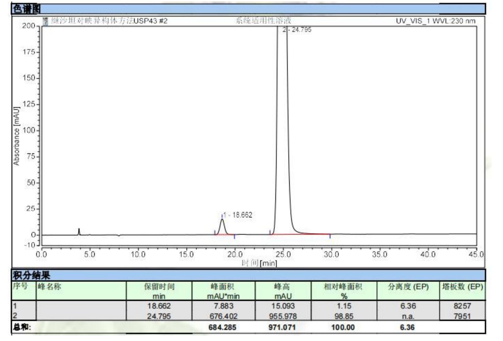 App ID: FLM-B230018 纈沙坦對映異構體的手性拆分 方法:USP 方法 色譜柱:Chiral INC 5u 250*4.6mm(貨號:FMG-JY5-I03) 檢測:UV 230nm 流動相:正己烷:異丙醇:三氟乙酸=850:150:1 流速:0.8ml/min 進樣體積:10μl 柱溫:室溫 圖譜: ![]() |