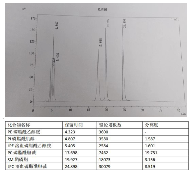 App ID: FLM-S250002 Superlu Silica 柱對(duì)大豆磷脂的檢測(cè) 方法:中國(guó)藥典第四部 色譜柱:Superlu Silica 5u 250*4.6mm(貨號(hào):FMG-5274-EONU) 檢測(cè):流速 1ml/min,ELSD, 柱溫 40°C(參考條件:漂移 管溫度為 72℃;載氣流量為每分鐘 2.0L) 流動(dòng)相: