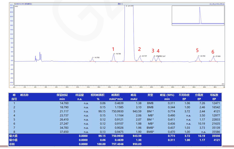 App ID: FLM-B250005 維生素K1 及其異構(gòu)體的手性拆分 色譜柱:Chiral NQ(2)-RH 3μm 250*4.6mm (貨號:FMG-AC3-A06-R) 流動相:咨詢 流速:0.8 mL/min 檢測波長:275nm 柱溫:25℃ 樣品濃度:N/A 稀釋劑:N/A 進樣量:20ul 色譜圖: