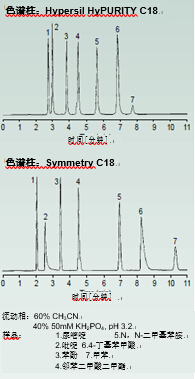 Symmetry C18 和 Hypersil HyPURITY C18 都是新一代固定相。你將期望他們提供相似的性能, 在某些情況下確實如此。然而,在這里給出的例子中,您可以看到峰保留時間、選擇性、甚至峰形的差異。