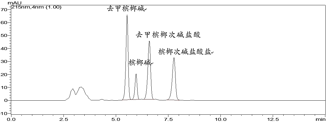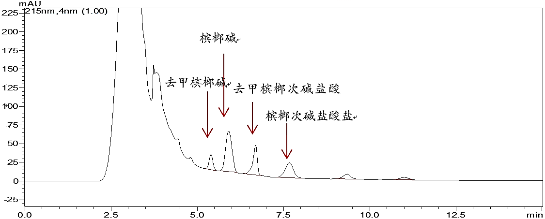 注:此方法在藥典方法基礎(chǔ)上做了適當(dāng)調(diào)整,能有效分析檳榔中四種有效成分。如只測定檳榔堿,可按藥典原方法進(jìn)行分析。