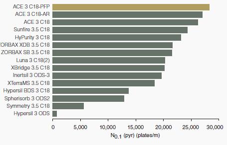 盡管所有ACE鍵合相的穩定性都很優異,但是一些鍵合相并不像其它鍵合相那樣穩定。例如,通常認為C18鍵合比柱長較短的烷基相、PFP相和苯基鍵合相更穩定。