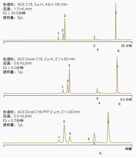試驗樣品的這些色譜圖在ACE Excel C18 2μmUHPLC色譜柱、ACE C18 3μmHPLC色譜柱和ACE C185μm色譜柱上以相同的流動相條件運行,結果闡明ACE固定相的選擇性一致,無論填充粒徑如何。