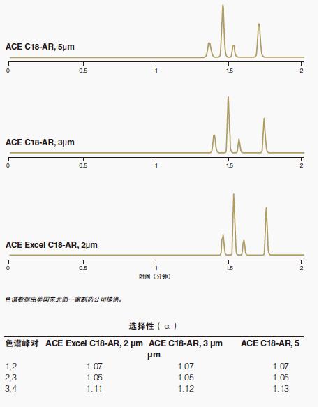 圖14闡明了當(dāng)使用相同的ACE鍵合相但不同粒徑填充的色譜柱進(jìn)行操作時,可以預(yù)見到分析物一致的譜帶間距類型(選擇性)。