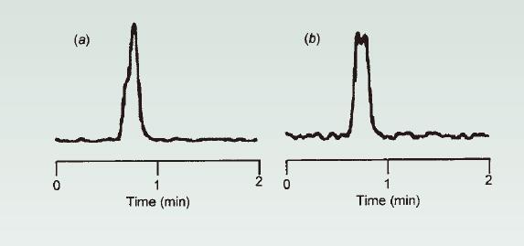 改變柱并未糾正這個問題(更換色譜柱不能解決此問題),所以玻璃料(篩板)堵塞并非導致這一現象的原因。如果柱上樣品的質量減少(減少上樣量)(圖4b),峰形看起來更像是兩個峰,而不是一個肩形峰。