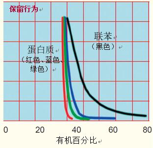 小分子的保留行為隨著有機溶劑濃度的改變而緩慢改變時(圖5,聯苯),一旦有機溶劑的濃度達到所需要的值,蛋白質的保留行為即發生突然改變,引起保留時間的快速變化(圖5,蛋白質)。