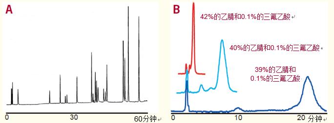 由于有機溶劑濃度的微小變化會引起的顯著的保留行為變化,等度洗脫很少被用于蛋白質中,因為峰變寬了,而有機溶劑的微小改變會導致蛋白質保留行為的巨大變化(圖6B)。