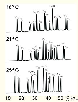 溫度會顯著影響肽圖譜中多肽的分離,如圖24所示。