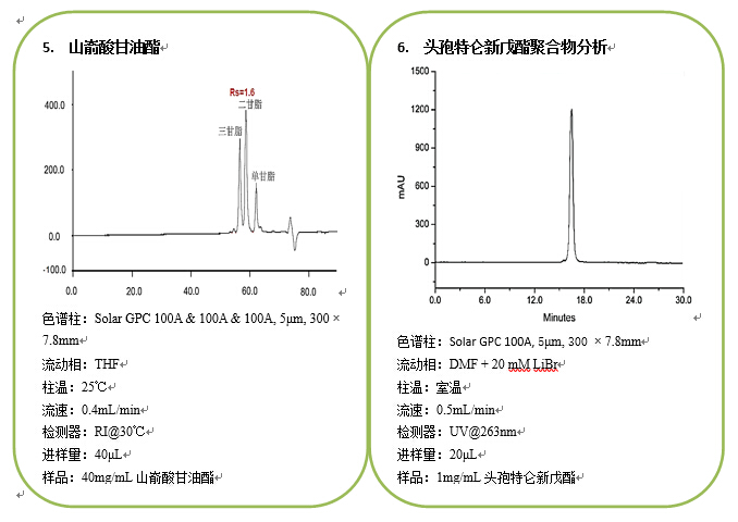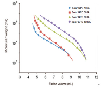 Solar系列體積排阻色譜柱,以高交聯度的聚苯乙烯/二乙烯苯(PS/DVB)顆粒為基質,具有極窄的粒徑和孔徑分布,使分析中保留時間與分子量具有準確的線性關系。高交聯度的多孔顆粒具有優異的化學和物理穩定性,因此在更換有機溶劑時可以使分子量校正曲線的形狀和色譜柱的柱效幾乎保持不變。