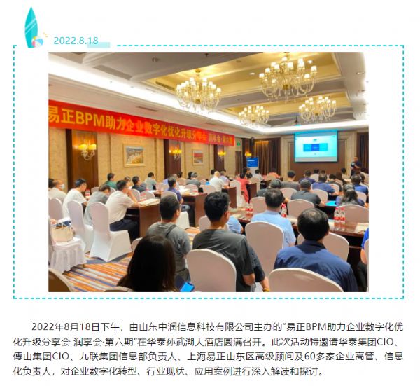前言:?潤享會,是山東中潤信息科技有限公司自2019年推出的系列活動。潤,代表山東中潤,意指潤澤萬物;享,代表分享,意有貢獻的含義;潤享會,旨在將更多的企業管理及信息化資訊分享給企業,與企業